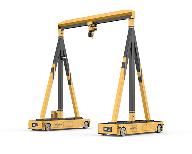 OMV智能龍門吊由兩臺獨立的全向平臺轉運車上安裝龍門吊組成,兩臺平臺轉運車具有雙車聯動功能,共同托舉龍門吊吊裝物料進行前進、后退、橫移、斜行、旋轉等全方位任意方向移動。