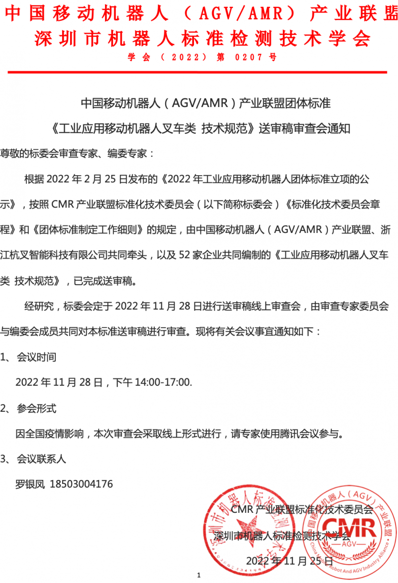 關(guān)于《工業(yè)應(yīng)用移動(dòng)機(jī)器人叉車類 技術(shù)規(guī)范》送審稿審查會(huì)的通知