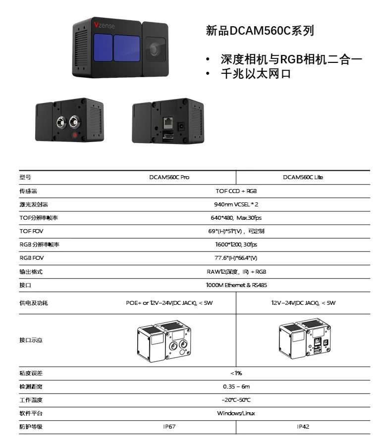 DCAM560C產(chǎn)品系列集成了團(tuán)隊(duì)近年來的研究成果,將2D RGB圖像與3D ToF面陣相機(jī)技術(shù)相結(jié)合,輸出在時(shí)間和空間上重合的RGB和3D圖像,每個(gè)像素都參與測(cè)距,不僅可以在獲取XY軸方向圖像的基礎(chǔ)上還能獲取Z軸方向上的距離信息,從而獲得高精度的深度圖,實(shí)現(xiàn)“三次元空間的感知能力”,用以滿足工業(yè)級(jí)客戶不同的使用場(chǎng)景,適用于工業(yè)自動(dòng)化,智能物流,智慧駕駛,智能安防,3D建模等需要3D感知物體與環(huán)境、構(gòu)建3D模型并進(jìn)行分析的領(lǐng)域。