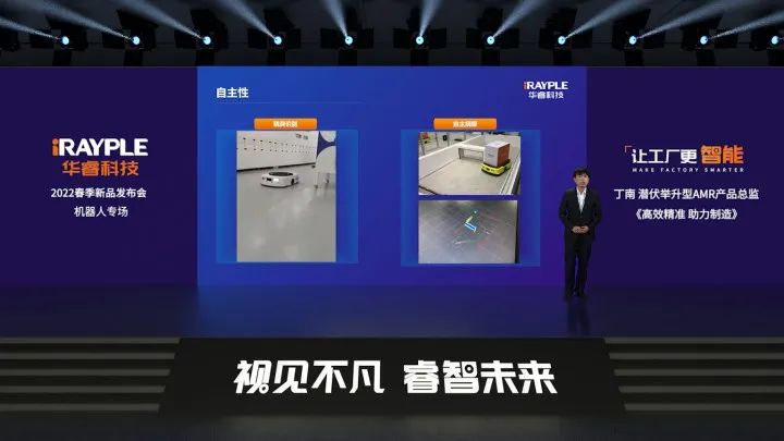 華睿科技潛伏舉升型AMR產(chǎn)品總監(jiān)丁南在本次發(fā)布會上以“高效精準 助力制造”為主題的演講。他表示:“潛伏舉升型AMR作為目前業(yè)內(nèi)最常用的AMR類型,通過不斷挖掘不同行業(yè)客戶的需求,除了滿足原有的電商倉儲行業(yè)外,在新能源,汽配,屏顯,重工等行業(yè)也得到了廣泛的應用。”全新推出的新一代600KG潛伏舉升型AMR,在續(xù)航,效率上較上代產(chǎn)品得到了大幅提升,同時通過安全傳感器、識別算法、導航算法、調(diào)度算法的智能融合,實現(xiàn)了整車的360°避障和立體避障,加強了產(chǎn)品安全性,模塊化設計,可根據(jù)實際項目、場景需要,靈活調(diào)整產(chǎn)品配置,滿足不同行業(yè)客戶的需求,升級了多種實施工具,降低了現(xiàn)場實施、維護設備的難度,讓用戶使用更簡單。