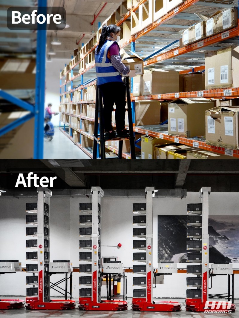 針對利豐供應鏈倉庫存儲密度低,存儲壓力大的痛點,海柔創新部署HAIPICK A42箱式倉儲機器人搭配立體貨架的組合存儲方式,其中立體貨架高度可高達4.3米。此外,由于ACR的產品設計理念是貨箱到人,對比潛伏式移動機器人機身設計更窄,使得貨架之間的巷道面積得以進一步縮小,從而提升存儲密度。改造后的前海