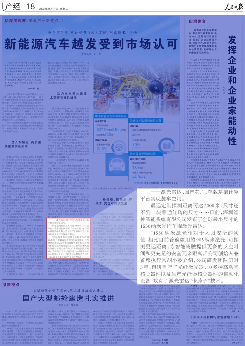 2022年9月7日,人民日報刊登了一篇名為《新能源汽車越發(fā)受到市場認(rèn)可》的文章,其中介紹了鐳神智能創(chuàng)始人胡小波帶領(lǐng)團隊攻克了我國被“卡脖子”的激光雷達技術(shù)問題。