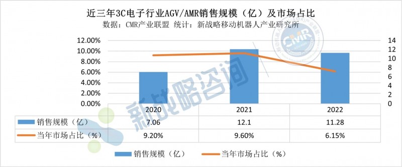 根據(jù)CMR產(chǎn)業(yè)聯(lián)盟數(shù)據(jù),新戰(zhàn)略移動(dòng)機(jī)器人產(chǎn)業(yè)研究所統(tǒng)計(jì),2022年3C電子行業(yè)占工業(yè)應(yīng)用移動(dòng)機(jī)器人整體銷售市場(chǎng)的6.15%,市場(chǎng)規(guī)模約為11.28億元,相較于2022年略有下降。