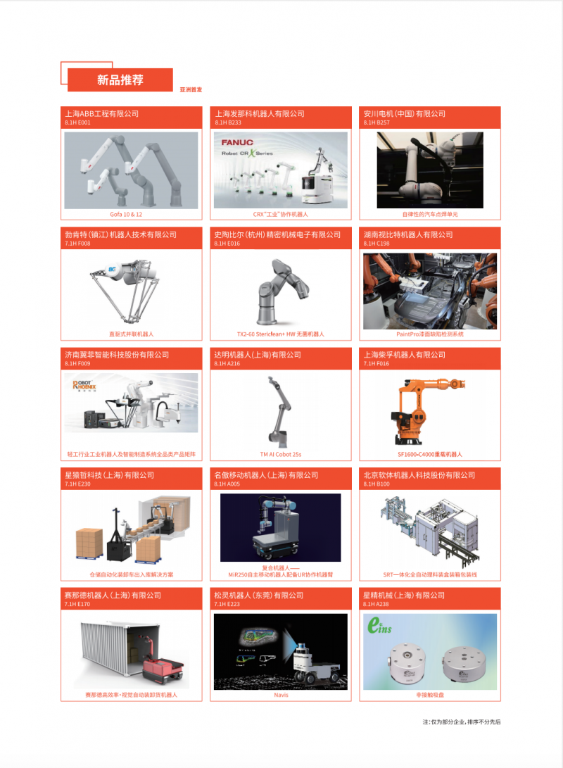 新品覆蓋了工業(yè)機(jī)器人本體、SCARA機(jī)器人、DELTA機(jī)器人、協(xié)作機(jī)器人、AGV/AMR、移動(dòng)復(fù)合機(jī)器人、減速器控制器傳感器和伺服電機(jī)執(zhí)行器等核心零部件、軟件及系統(tǒng)集成應(yīng)用等,彰顯最前沿的機(jī)器人技術(shù),為新型工業(yè)化注入新動(dòng)能。