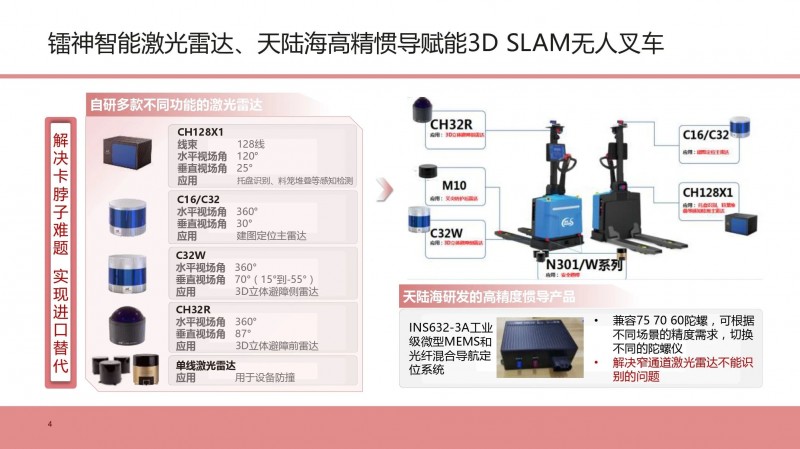 在論壇分享會上介紹了無人叉車配置的技術領先全球的鐳神智能激光雷達系列產品,解決了卡脖子難題,實現(xiàn)國產化自主可控,每臺無人叉車周身配置7-8顆激光雷達,提供豐富穩(wěn)定的全方位立體感知信息,做到更安全、更穩(wěn)定、更可靠。