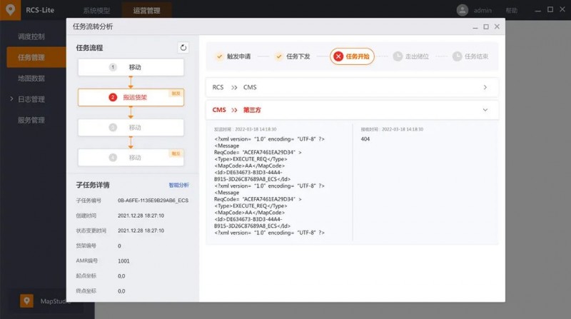 在AMR核心任務(wù)處理單元中,可呈現(xiàn)全鏈路任務(wù)流轉(zhuǎn)圖,將任務(wù)從下發(fā)到完成的所有交互信息直觀展示,讓現(xiàn)場實施交付更高效,可用于工廠物流場景中的儲位管理、任務(wù)管理、貨架/容器管理等場景。