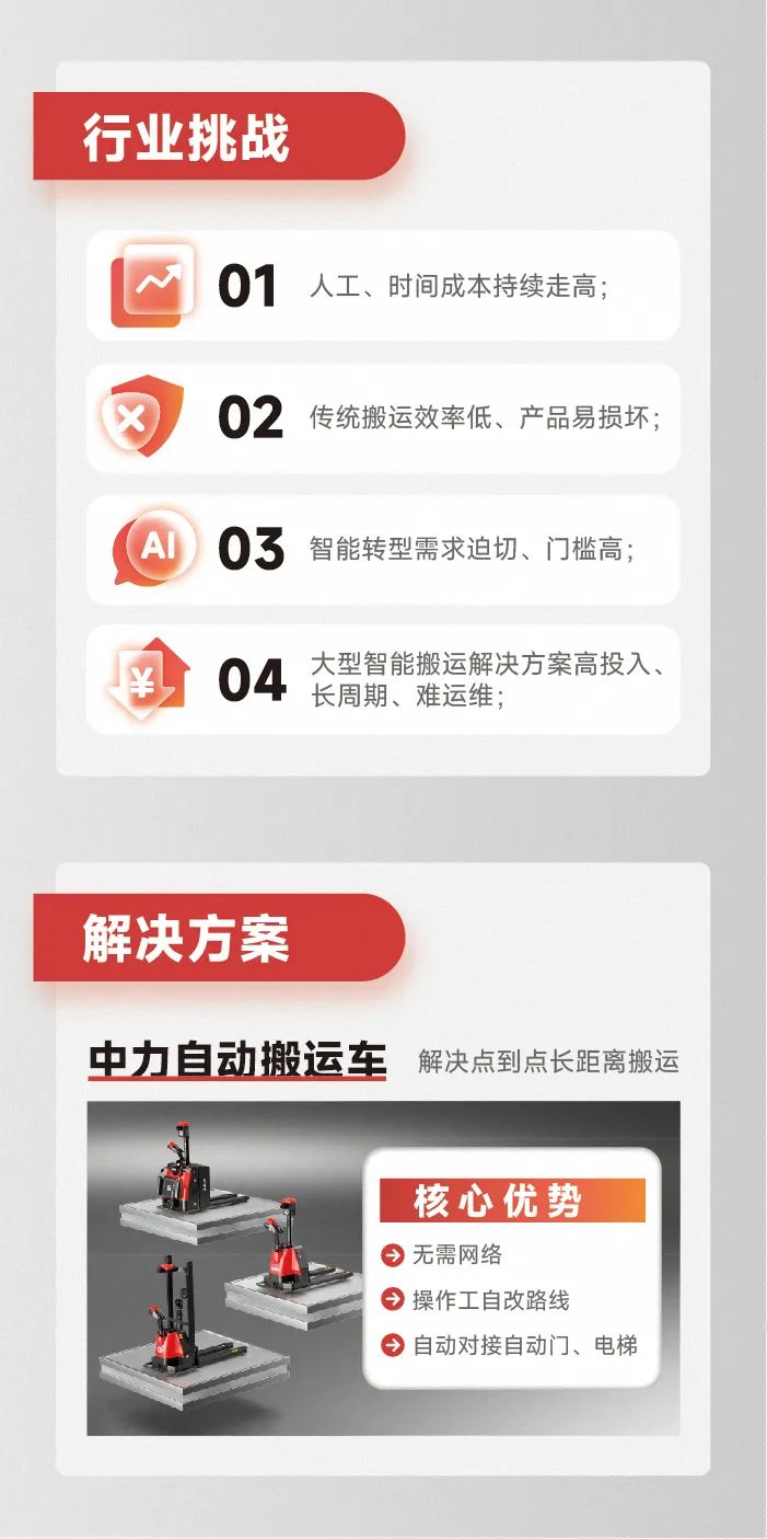 基于對市場的深度洞察,去年以來中力定義行業新概念——自動搬運車,專注解決點到點長距離無效搬運,破解用工難題?;诰珳矢咝У淖詣优渌停辛ψ詣影徇\車助力生產效率大幅提升!