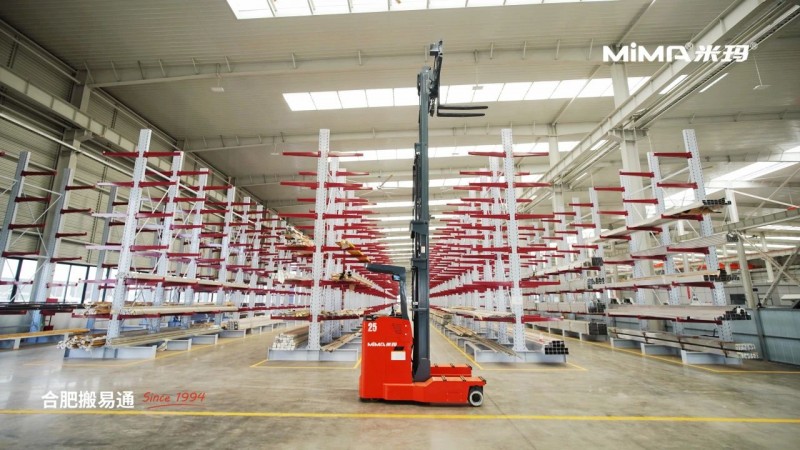2、為了滿足長(zhǎng)重物料的靈活搬運(yùn)需求,建議客戶采購(gòu)并使用MiMA米瑪窄體全向叉車MQ25,這款叉車額定載荷2.5噸,擁有多種行駛模式,側(cè)行通道更小,能夠完美適配窄巷道作業(yè)環(huán)境。