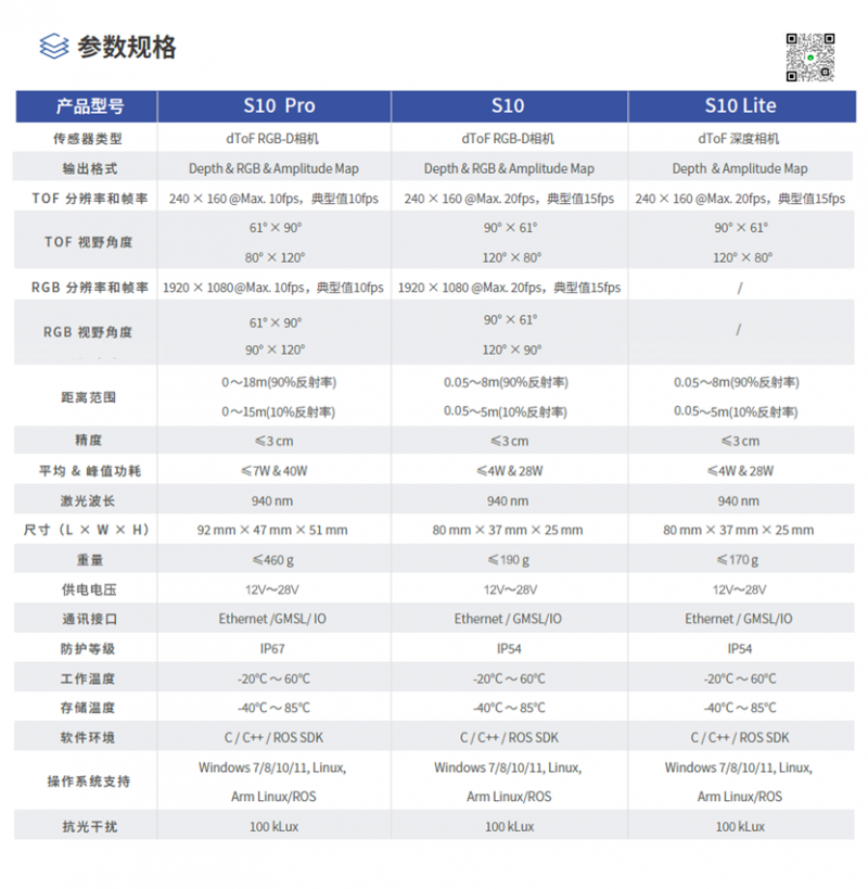• 遠距離抗干擾感知:S10基于dToF技術實現18米遠距離探測,在室外強光(100kLux)環境下仍可穩定輸出深度數據,提升無人叉車、割草機、室外巡檢機器人等設備的避障能力。