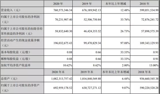 據(jù)寧波中大力德智能傳動股份有限公司發(fā)布的2020年年度報告顯示,公司2020年度實現(xiàn)營業(yè)收入 7.61億元,同比增長12.48%;歸屬于上市公司股東的凈利潤7023.19萬元,同比增長33.76%,扣除非歸母凈利潤為5883萬,同比增長26.73%。