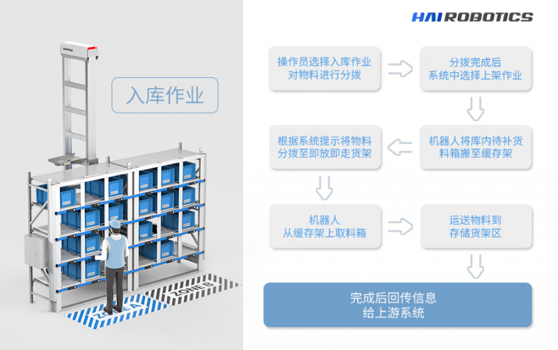 入庫:通過緩存貨架的方式,減少人機等待時間,提升入庫的效率。