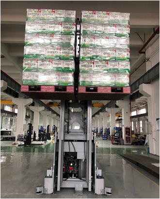雙工位平衡重叉式AGV屬于國內(nèi)首創(chuàng),可同時插取兩個托盤,托盤載重可達3噸,并且其配備了3D相機識別系統(tǒng),在托盤直接堆垛存儲場景中,可識別托盤對地高度,輔助判斷貨叉提升高度,實現(xiàn)托盤準確搬運,3層托盤直接堆垛,托盤堆垛高度可達6米左右,采用密集存儲的方式。對于百威啤酒這一類的易碎品,更加的安全可靠。