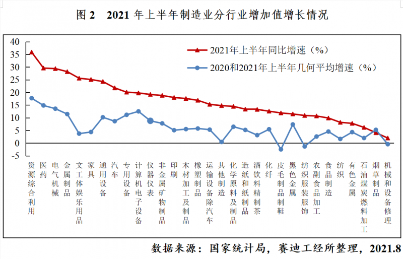 從整體看,2021年上半年工業(yè)生產(chǎn)呈恢復(fù)性增長(zhǎng)態(tài)勢(shì)。上半年,工業(yè)增加值同比增長(zhǎng)15.9%,增速較上年同期加快17.2個(gè)百分點(diǎn);兩年平均增長(zhǎng)7.0%,平均增速較2019年同期加快1個(gè)百分點(diǎn),達(dá)2015年以來同期最高水平。