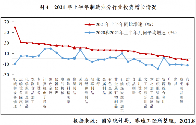 高技術(shù)制造業(yè)帶動(dòng)投資結(jié)構(gòu)進(jìn)一步優(yōu)化。上半年,高技術(shù)制造業(yè)投資同比增長(zhǎng)29.7%,兩年平均增長(zhǎng)17.1%,平均增速大幅超出制造業(yè)平均水平15.1個(gè)百分點(diǎn),且較2019年同期加快6.7個(gè)百分點(diǎn)。其中,航空航天器及設(shè)備、計(jì)算機(jī)及辦公設(shè)備、醫(yī)療儀器設(shè)備及儀器儀表、電子及通信設(shè)備制造業(yè)投資上半年分別增長(zhǎng)56.4%、47.5%、34.2%、29.9%。