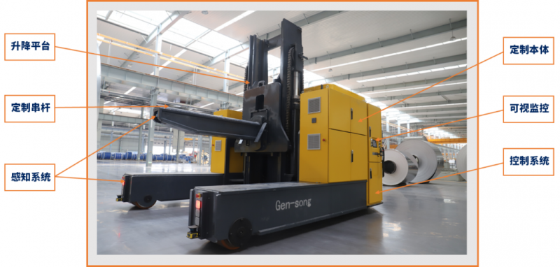 超重載(20噸級+)串桿式堆高叉車AGV產品是由客制化AGV本體、智能識別系統、智能調度系統、智能監控系統等軟硬一體化相結合的智能系統產品。