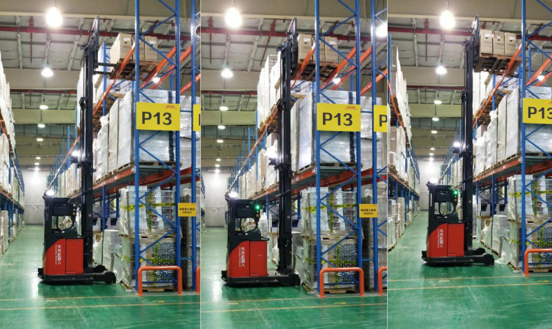 該項目對單體車定位、感知、控制的穩定性要求極高。該項目中,兩個貨架之間最窄處僅為3m,車體運行安全距離為3.3m以上,極限的作業寬度對視覺無人叉車的感知能力提出挑戰;同時,7m以上貨架的上下架需要無人叉車AGV具備橫梁檢測、放貨空間檢測能力、以及報警能力。