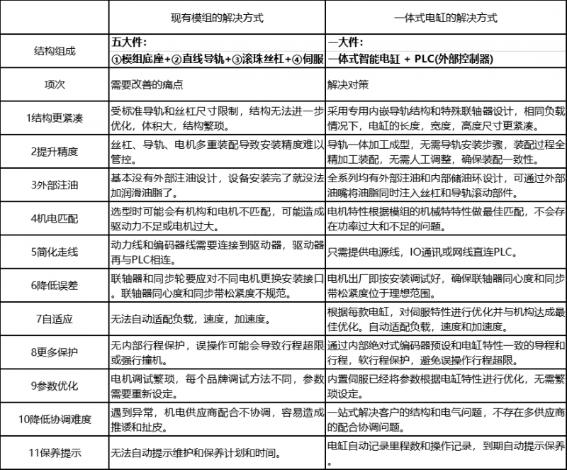 和傳統的組合型的直線模組相比,智能電缸是機電一體化,高度集成的智能型電動執行單元。不僅能實現精確的定位和移載,更重要的是其對伺服和控制進行了優化,使得智能電缸在精度控制,運動特性,精密力控,安全性等方面比傳統“直線模組+伺服電機”的方式有著更卓越的性能。