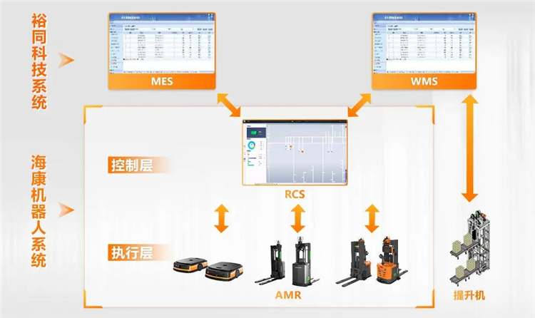 機器人控制系統RCS 無縫對接裕同的WMS以及MES系統,對接提升機進行跨樓層任務,24 小時全方位管理AMR的運行狀態和路徑規劃。AMR穿梭在原材料倉庫、生產車間、成品倉庫,用自動化、智能化手段,簡化規范了現場工藝流程,高效完成各類物流任務。