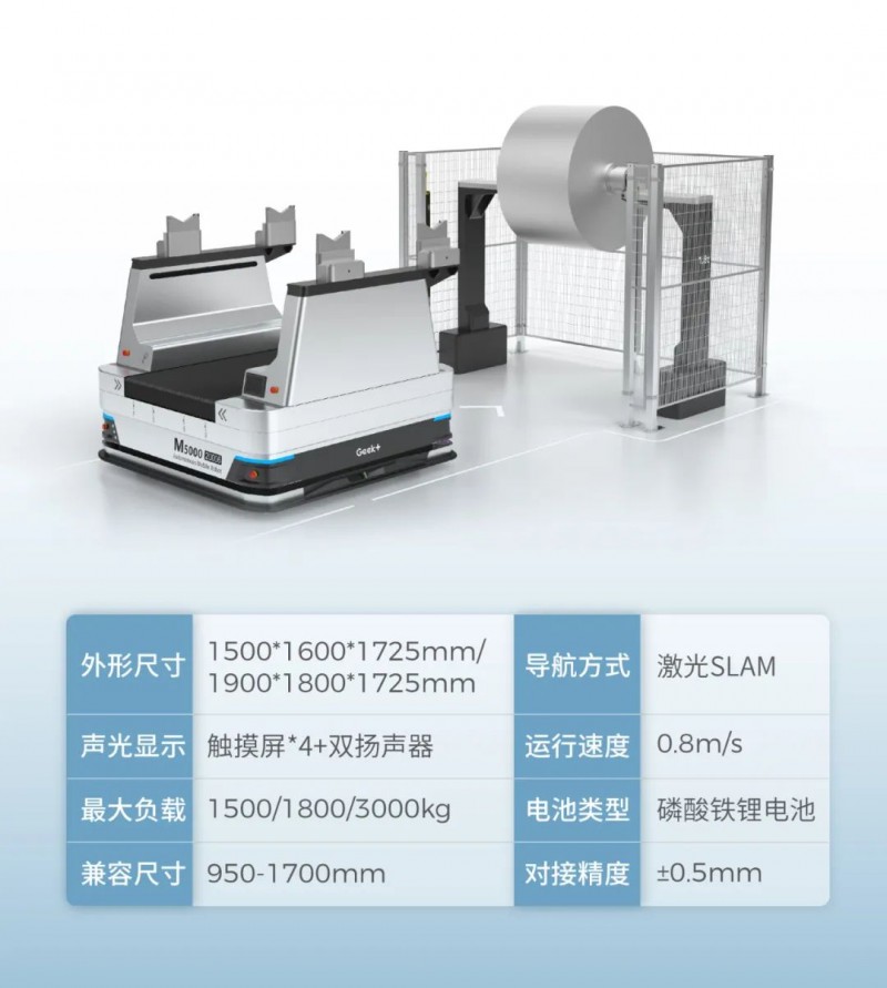 前工序搬運的極卷非常重,勞動強度大,人工上下料對接難度大。且產能快速擴張,造成招工難、用工難,人力成本和人工操作安全隱患同比升高,給企業帶來管理困難和更大的風險。極智嘉雙舉升機器人可搬運最高重達3噸的卷狀物料,且雙排叉臂的結構設計使機器人可在上滿料軸的同時帶走空料軸,一次到達即可完成空滿交換任務,搬運路程減半,效率翻倍、快速節能。